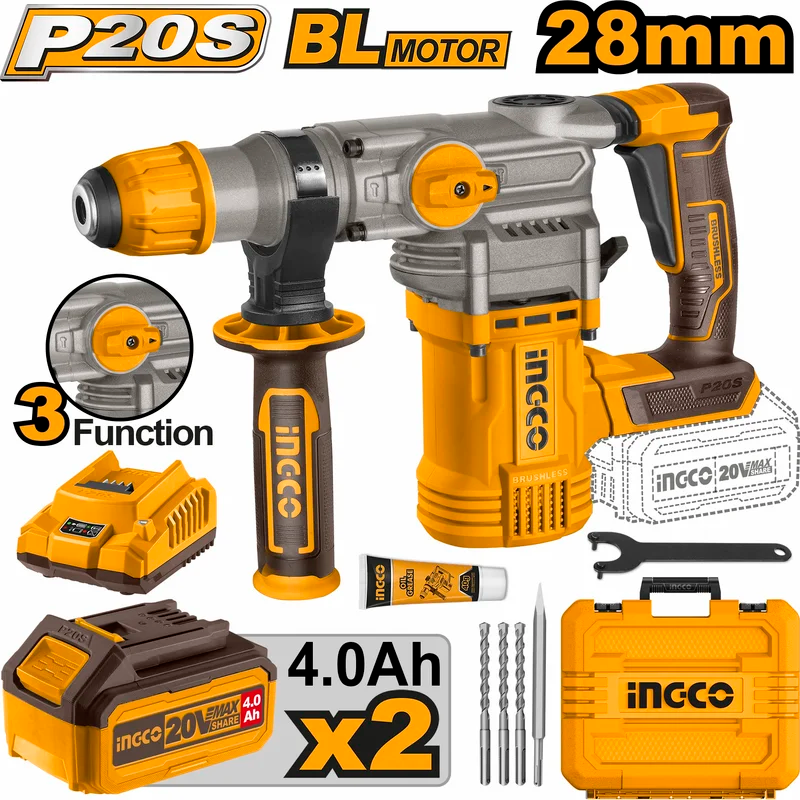 перфоратор INGCO CRHLI202882, АКБ 4 Ач - 2 шт., зарядное устройство на 2.0А, эргономичная рукоятка, бур - 3 шт. (8/10/12 SDS-plus), пика - 1 шт. (SDS-plus), гарантийный талон, паспорт, пластиковый кейс |