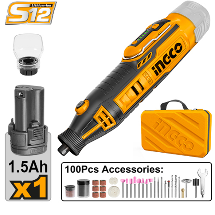 аккумуляторная шлифовальная машина INGCO CMGLI12011, АКБ 1x1,5 Ач, зарядное устройство, аксессуары 100 шт., паспорт, гарантийный талон, сумка |