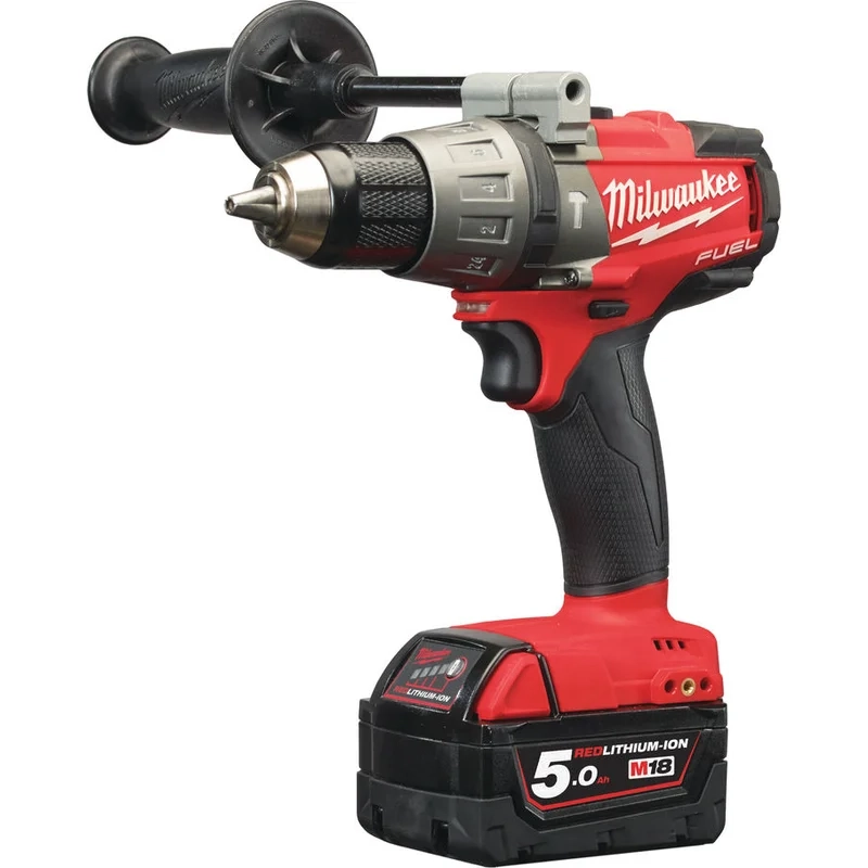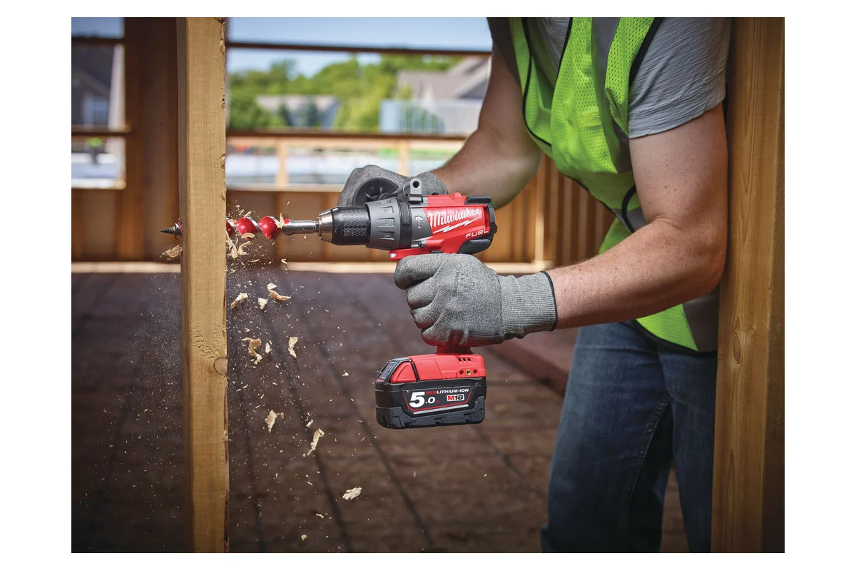 Аккумуляторная дрель-шуруповерт Milwaukee M18 FUEL FDD-0, Аккумулятор Milwaukee M18 B5 5.0 Ач (2 шт.), Быстрое зарядное устройство Milwaukee M12-18 FC, Инструкция по эксплуатации, Кейс Milwaukee Heavy Duty 100 предметов, Кейс |