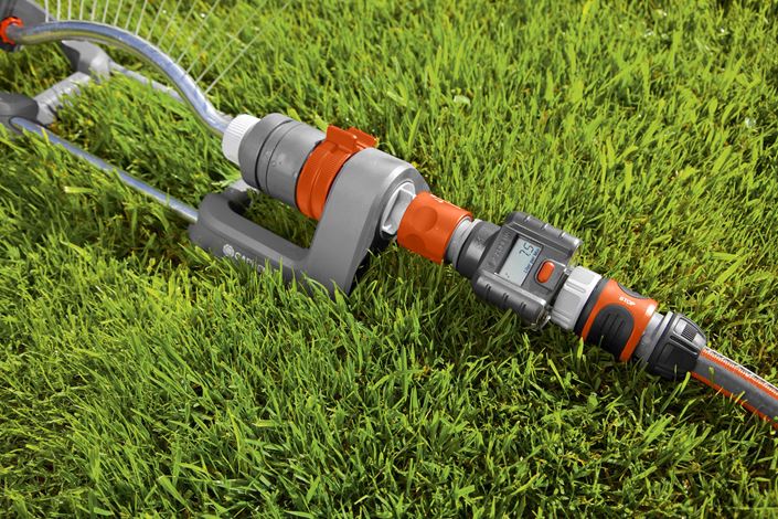 Счетчик воды GARDENA работает от батарейки и может быть одним движением подключен к крану, дождевателю, насосу, станции бытового водоснабжения и пр.