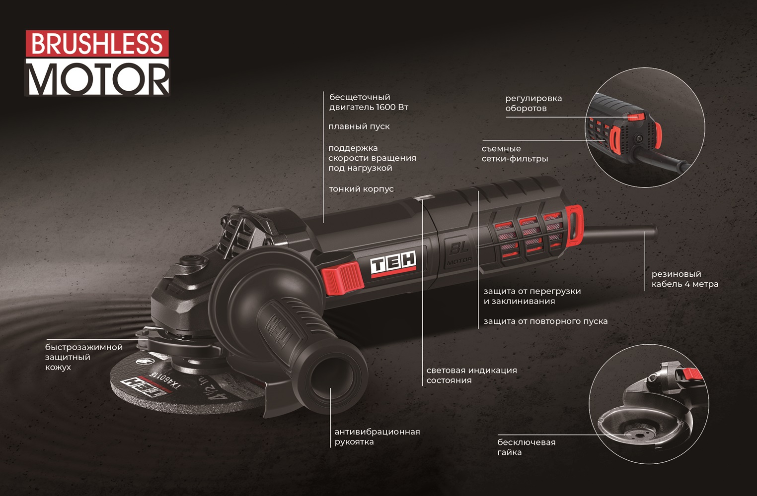 - Шлифмашина оснащена функцией плавного пуска, поддержанием оборотов при нагрузке и защитой от повторного пуска (при возобновлении подачи тока в сети).
