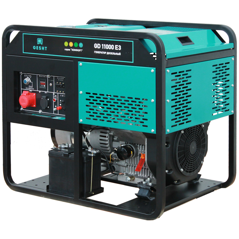 Дизельный генератор GESHT 400/230 GD11000E3 - Конструкция собрана максимально компактно, но с учетом требования безопасности: открытый корпус обеспечивает приток воздуха и не допускает перегрева оборудования. Старт генератора допускается только при повороте ключа, что не дает изделию запуститься автоматически. Розетки разделены по цвету: трехфазная закрыта красной крышкой, однофазная - черной. Имеется выход на 12 В.