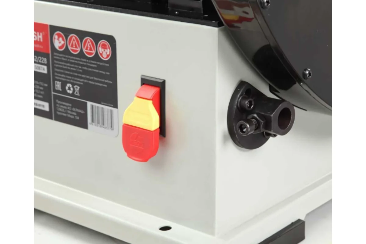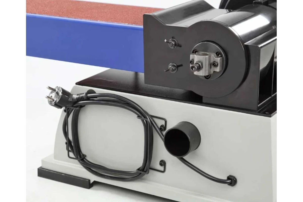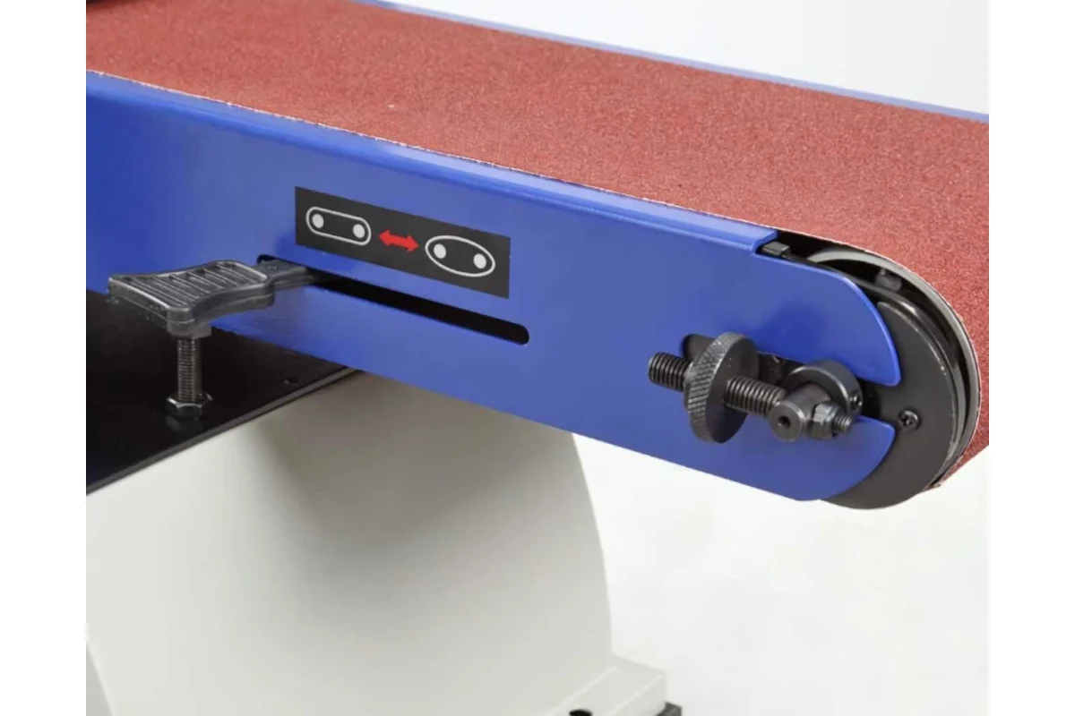 Абразивные материалы стандартные: лента – 1219х152 мм, диск – Ø228 мм. Станок надежно удерживается на верстаке за счет опор-виброгасителей, но для дополнительной безопасности его можно закрепить. Для этого на опорной платформе предусмотрены 4 отверстия.