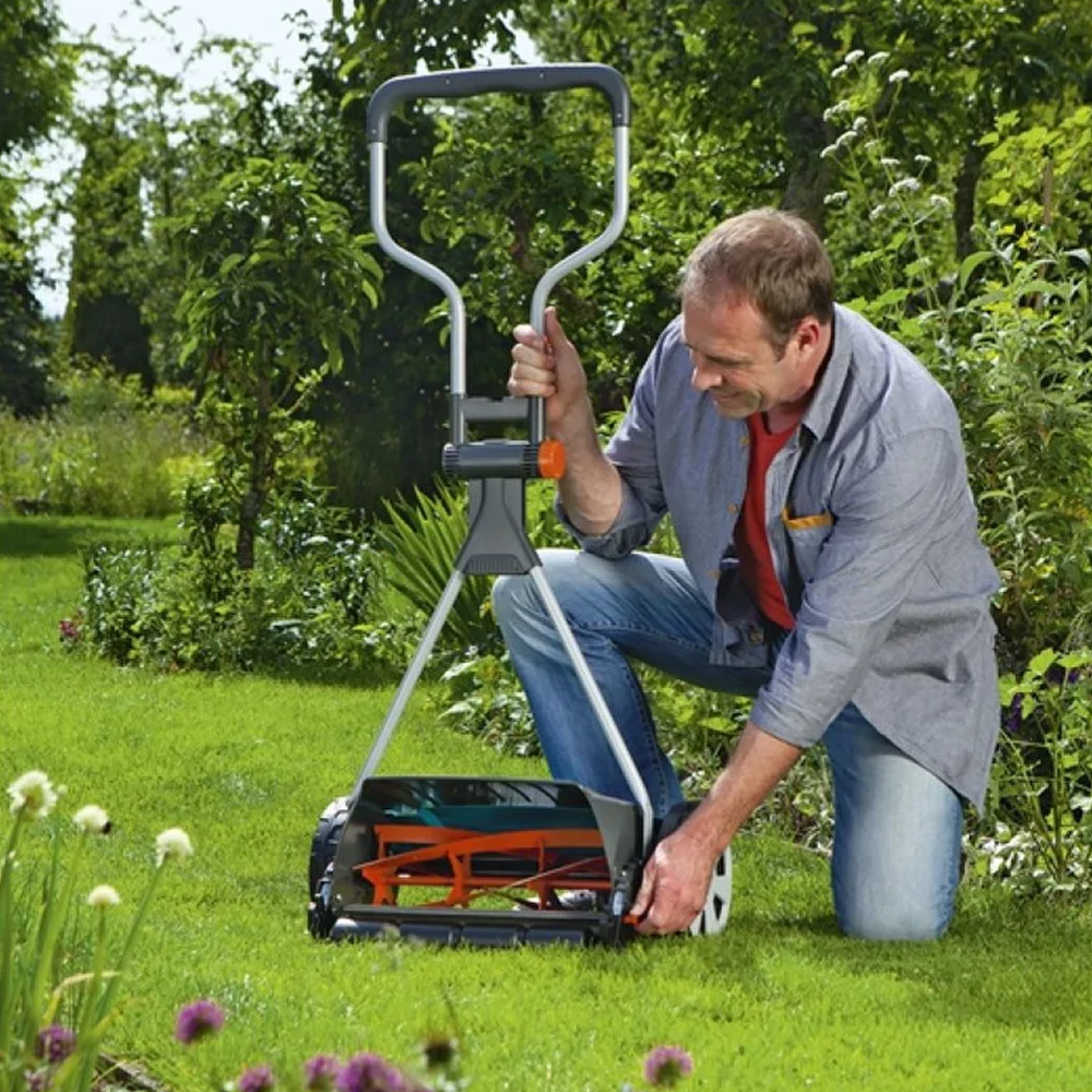 Механическая барабанная газонокосилка Gardena используется для получения английского газона, финишной обработки лужайки. Колеса не портят газон и обеспечивают легкий ход.