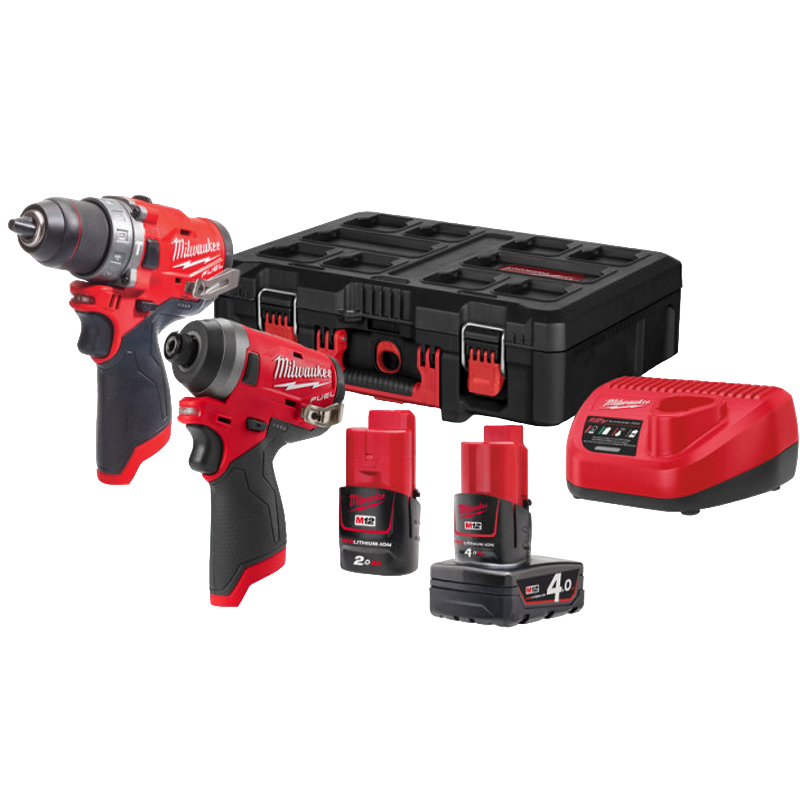 Аккумуляторная ударная дрель-шуруповерт Milwaukee M12 FUEL FPD-0;, Аккумуляторный импульсный винтоверт Milwaukee M12 FUEL FID-0;, Аккумулятор Milwaukee M12 B4 4.0 Ач;, Аккумулятор Milwaukee M12 B2 2.0 Ач;, Зарядное устройство Milwaukee C12 C;, Кейс Milwaukee PACKOUT Box (ящик малый) |