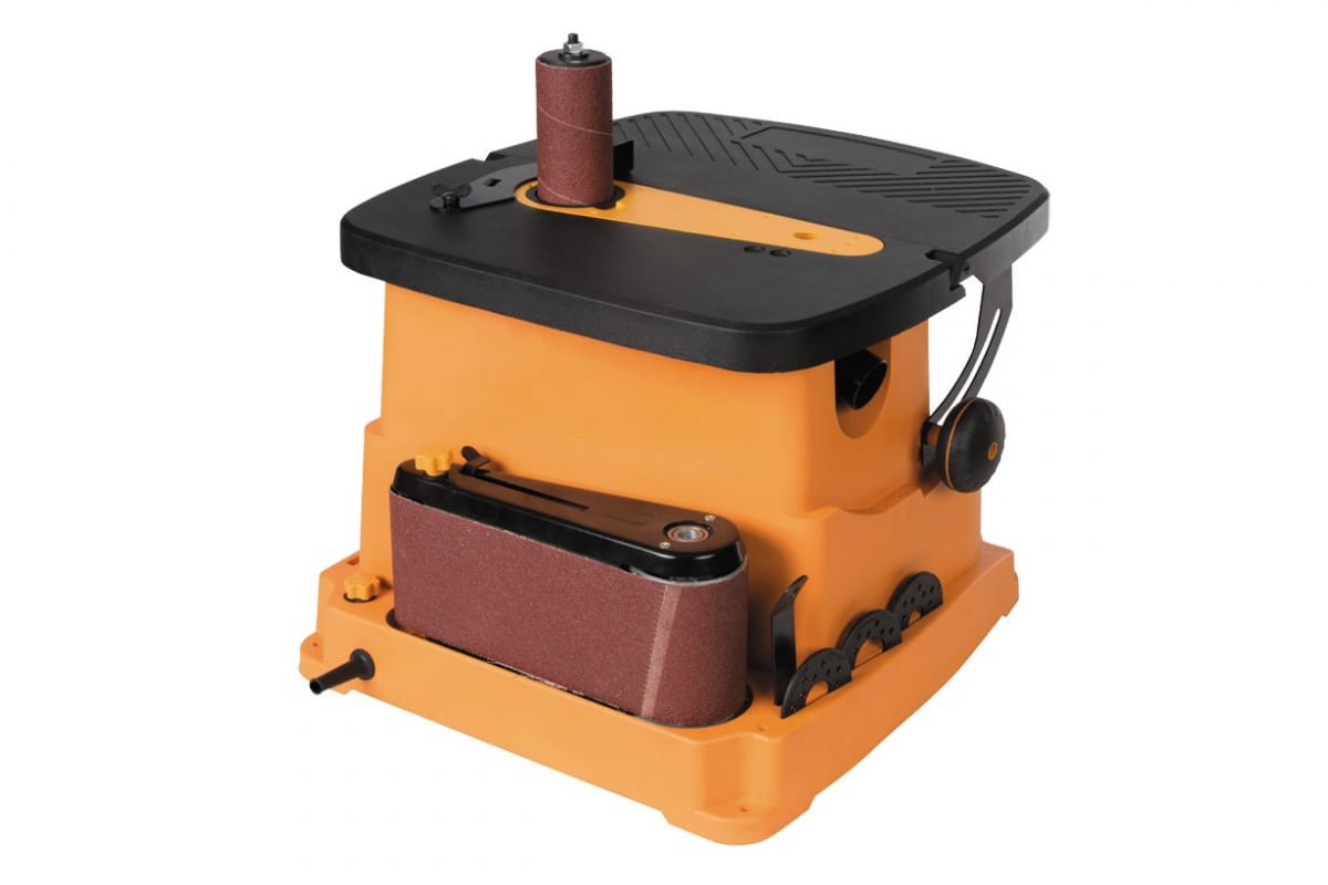 Ленточный шлифовальный узел подойдет для заточки инструментов. Эффективность работы обеспечивает наклонный стол из алюминиевых отливок. Регулировка угла наклона позволяет вести универсальную обработку заготовок.
