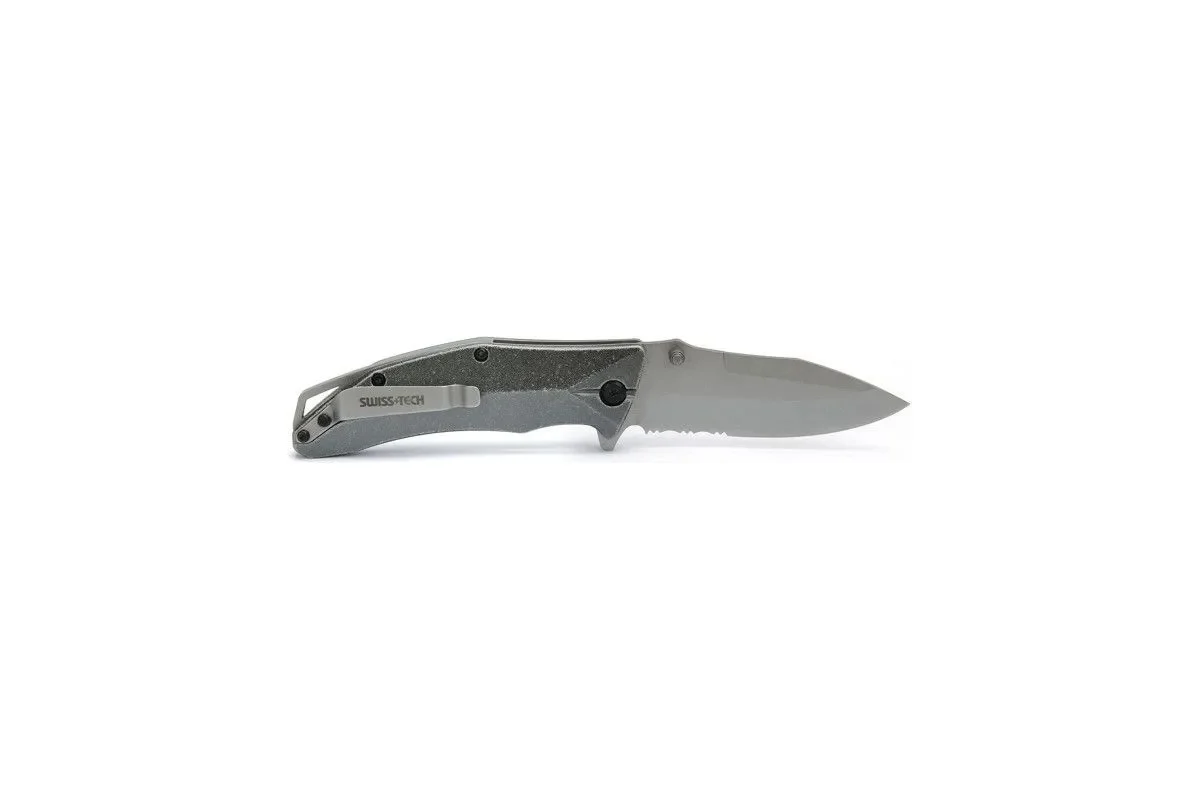 Нож складной 9 см стальное лезвие рукоять алюминий Swiss+Tech ST014005 идеальный выбор для тех, кто ценит качество и функциональность. Клинок изготовлен из прочной высокоуглеродистой нержавеющей стали с добавлением молибдена, ванадия, он обладает высокой ударной вязкостью и легко затачивается. Часть клинка - это гладкое лезвие, часть - пилообразные зазубрины по режущей кромке.
